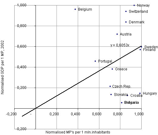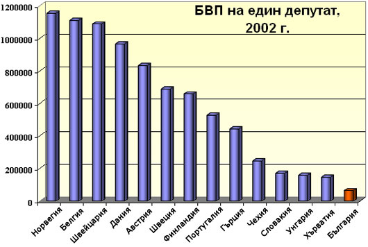 За да достигне до осредненото положение, България, при запазване броя на населението, е необходимо да увеличи над три пъти БВП от 1968 щ.д.на човек от населението на 6600 щ.д.на човек от населението или да намали броя на депутатите до 13,84.